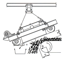 (2)非帶式電磁除鐵器:必須選擇電動行走小車 。以便電控自動吸、棄鐵。輕型特別是三吊點的除鐵器,一般選擇電動單軌單車吊掛。重型設(shè)四吊點的除鐵器可以選擇電動雙軌或單軌組合行走架。重型設(shè)三個吊點的可以選擇電動單軌組合行走架。